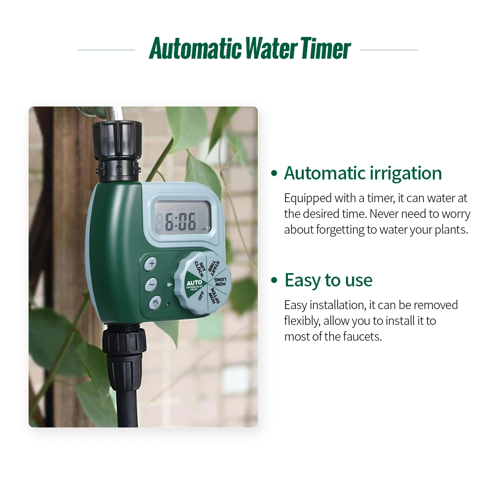 Su tasarrufu ve zamandan tasarruf gündüz gece fark etmeksizin istenilen zamanda ve istenilen sürede sulama yapılacak alana gitmeksizin kullanım Alet gerektirmeyen kolay montaj Bu dijital su zamanlayıcı, bahçe sulama sisteminizi akıllı bir hale getirir. Özellikler :