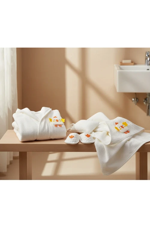 Ens Group Avm 0–1 Yaş Bebek Bornoz Seti %100 Pamuk Civciv Figürlü 4 Parça (Bornoz + Havlu + Terlik + Kese)