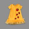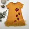 Elbisenin üst kısmında yer alan payetli çilek nakışları, çocukların ilgisini çekerken, eteğindeki fırfır detayları hareketli bir görünüm sunar.