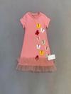 Renkli kelebek nakışları, elbiseye sevimli bir dokunuş katarken, eteğindeki fırfırlar hareketli bir görünüm sağlıyor.