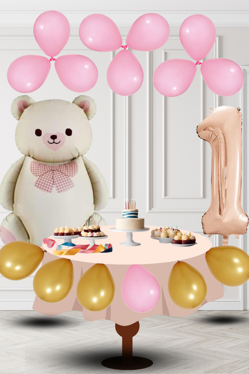 1 Yaş Retro Folyo Krem Ayıcık Pembe Gold Balon Rose Gold Rakam Doğum Günü Süsleme