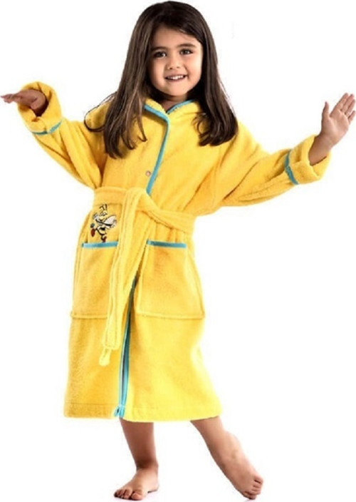 %100 pamuk Sağlıklı ve Nefes alabilen kumaş kalitesinde ,Bukle Güneş Sarısı renk ,Turkuaz renk biyeli ve önü çıtçıt kapalı,sabit kemerli ,Sol Cep üstünde ve arkada ayrıca Çalışkan Arı nakışlı bukle bornoz; Plajda,Havuzda ve yüzme derslerinde Annelerin kurtarıcı ürünü; Kullanımı Pratik ve Şık tasarımı ile çocukların tarzı ile fark yarattığı rahat kullanım özelliğine sahiptir; Kapşonlu olduğu için ekstra saç kurulama havlusu gerektirmez; Önü çıtı çıt kapamadır;