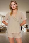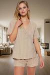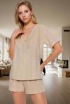 Yaz aylarının sıcak günlerinde kendinizi serin ve rahat hissetmenizi sağlayacak, %100 pamuk keten kumaştan üretilen bu pijama takımı, hem şıklığı hem de konforu bir arada sunuyor. V yakalı, kısa kollu gömlek ve boru paça şorttan oluşan takım, regular kalıbıyla her vücut tipine uyum sağlar. Bej rengi ve zarif çizgili deseniyle her ortama uyum sağlayan bu pijama takımı, gün boyu rahatlık ve stil sunar. Bağlamalı detayıyla kendinizi daha güvende hissedeceksiniz.