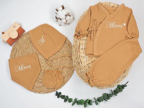 Gros Shop %100 Pamuk Organik 4Katlı Müslin Kumaş Hastane Çıkışı Seti (Kişiye Özgü İsimli Nakış Desenli)