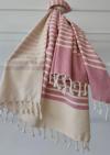 %100 pamuktan üretilen peştemal, 80x190 cm ölçüsüyle şezlong örtüsü ve plaj havlusu olarak ideal kullanım sunar.