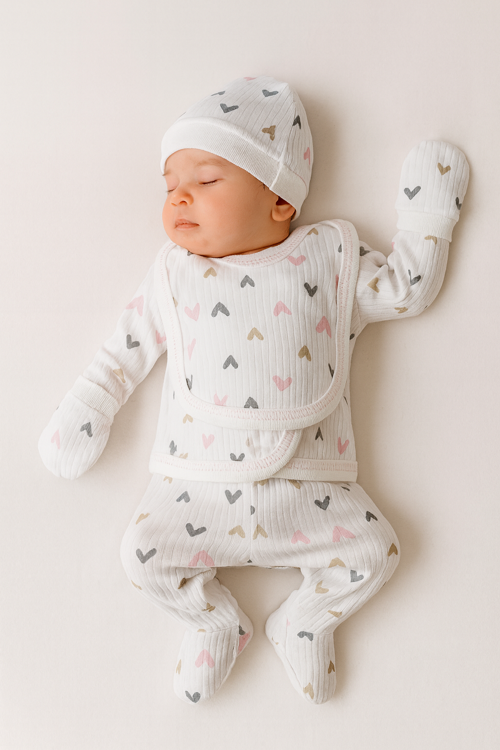 Yenidoğan bebekler için tasarlanan 5 Parça Hastane Çıkışı Seti, %100 pamuklu raporlu penye kumaştan üretilmiştir.