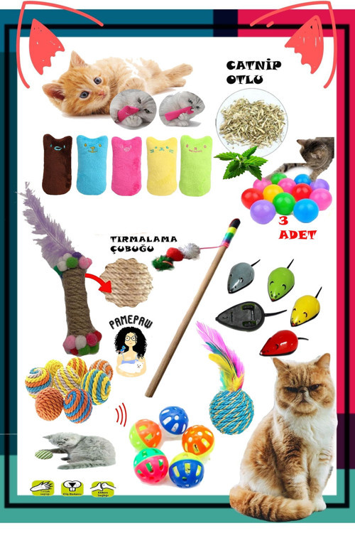 7'li Set : Kedi Nanesi Kokulu Peluş Oyuncak , Sarma Top , Olta , 3'lü Mini Top , Çıngıraklı Top , Çek Bırak Fare , Tüylü Top , Kedi Diş Kaşıma Tırmalama Çubuğu HER ÜRÜNDEN 1 ER ADET , MİNİ TOPTAN 3 ADET VARDIR