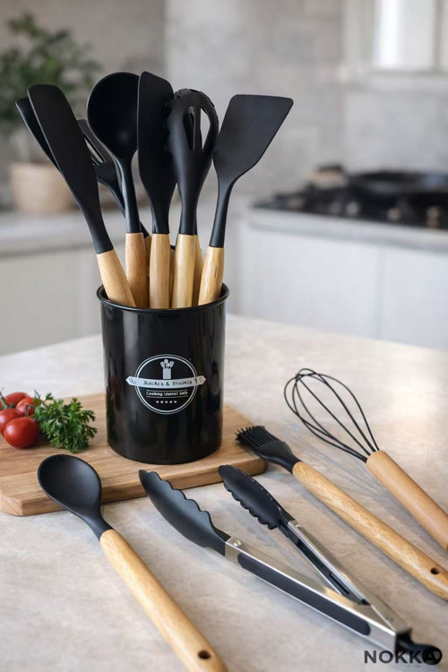Nokka 11 Parça Bambu Saplı Silikon Mutfak Seti Kaşıklıklı | Isıya Dayanıklı Spatula Kepçe Çırpıcı Maşa Seti | Siyah
