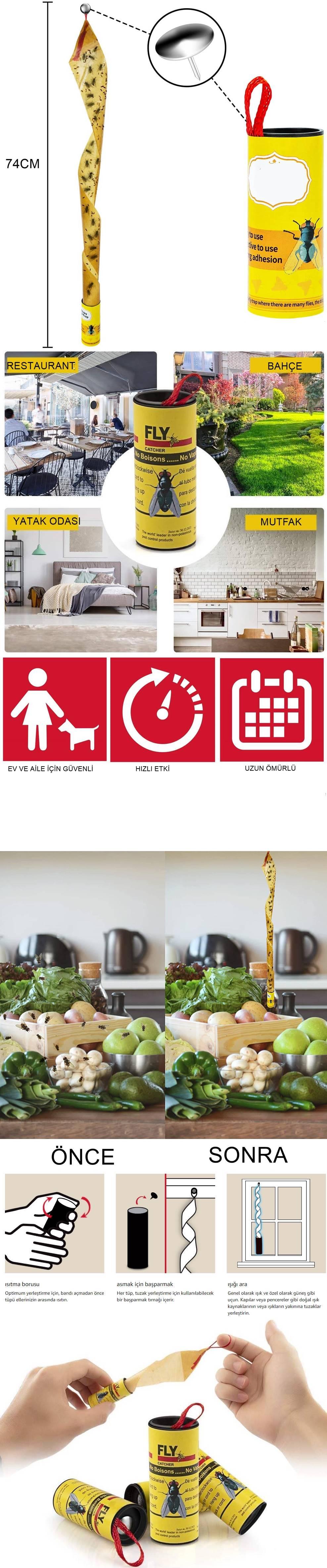 ÇEŞİTLİ DURUMLAR İÇİN UYGULANABİLİR: Sinekleri öldürmek için ilaç veya sprey kullanımının uygun olmadığı yerler (oteller, restoranlar, hastaneler, depolar) için uygundur. Sinek şeritleri, süper yapışkan yapıştırıcı, çok güçlü yapışma ile su geçirmez kağıttan yapılmıştır, sinekler çekildikten sonra kaçmalarının bir yolu yoktur .