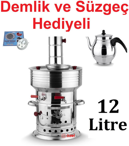 Sobapark 12 Litre Paslanmaz Metal Odunlu Kömürlü Çay Semaveri Büyük Çift Musluklu DEMLİK HEDİYELİ Semaver 12