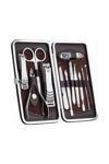 Setin içinde kulak çekme aparatı, çok amaçlı makas, manikür makası, üç farklı tırnak makası/düzeltici, pense, kir temizleme aparatı, kaş cımbızı, manikür bıçağı, tırnak törpüsü ve akne iğnesi yer almaktadır.