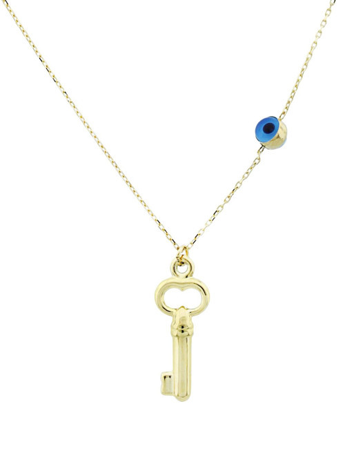 14 Ayar Altın Kilit Nazar Kolye 'miz aslında klasiklerimizdendir. Altın kolyelerde anahtar figürünü ilk olarak dünyaca ünlü Tiffany.co markası kullandı. Daha sonradan birçok firma kendi stilleri ile anahtar kolye uçları yaptılar. Tamamen parlak ve sarı altın ( 14 ayar yeşil rengi ) olan kolyemiz günlük kullanıma yatkın minimalist görsele sahiptir.