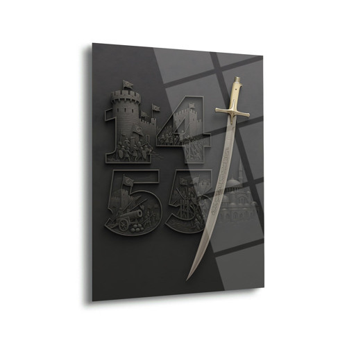 1453 yılında gerçekleşen İstanbul’un Fethi’ni simgeleyen bu özel cam tablo, Fatih Sultan Mehmet’in liderliğini ve Osmanlı tarihinin en önemli zaferlerinden birini sanatsal bir kompozisyonla yansıtır. Tasarımda yer alan 1453 rakamı içerisinde surlar, savaş sahneleri ve fetih detayları estetik bir şekilde işlenirken, yanında yer alan kılıç ve mimari öğeler tabloya tarihi bir derinlik kazandırır.