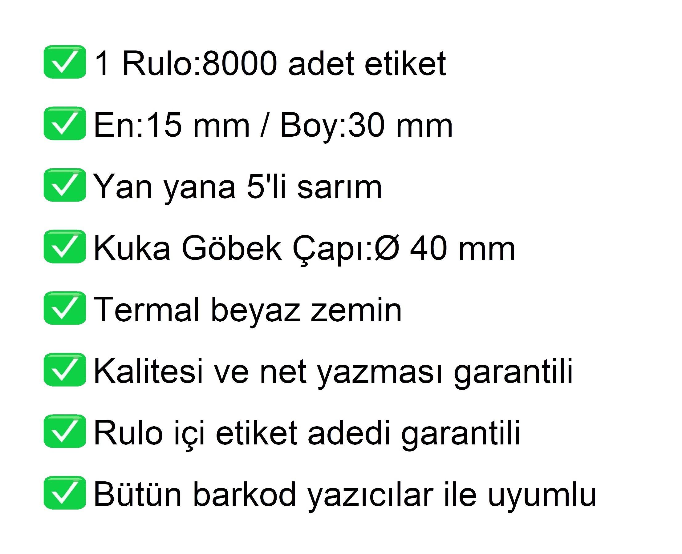 15x30 mm Termal ürün Barkod Etiketinin özellikleri ve açıklamaları aşağıda verilmiştir. Farklı ölçü seçenekleri ve daha fazla bilgi için mağazamızı ziyaret edebilirsiniz.