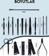 - 1 büyük tırnak makası1 küçük tırnak makası1 sivri uç tırnak makası ( Tırnaklara şekil vermek için )1 çift uçlu komedon1 törpü1 et ittirici1 çift taraflı tırnak kaldırma aleti1 makas1 pedikür bıçağı ( ayak tabanları için )1 çarpraz pedikür bıçağı ( ayak tabakları için )1 kavisli pedikür bıçağı ( ayak tabanları için )1 V şeklinde et itme ( Tırnak çevresinde ki ölü deriyi temizleme )1 itme çubuğu ( Tırnak içinde ki ve çevresinde ki kirleri temizler )1 tırnak temizleme 1 cımbız1 iğneli komedon1 kulak temizleme