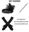 Siyah Charleston Saç Bandı: Bu zarif saç bandı, 1920&rsquolerin flapper tarzını mükemmel bir şekilde tamamlar. Siyah rengiyle her türlü gece elbisesiyle uyum sağlar, üzerindeki ışıltılı taşlar ve zarif tüy detaylarıyla göz alıcı bir görünüm sunar. Göz alıcı bir şekilde takarak, Gatsby'nin dünyasında kendinizi bir yıldız gibi hissedebilirsiniz.