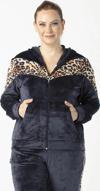 1927 Leopar Detaylı Lacivert Tam Kalıp Tarz Kapüşonlu Kadife Bülük Beden Eşofman Takımı Kumaş Türü: Kalın kadife. Ürün ön bedende ve alt yan şeritinde leopar kadife kullanıldığından şık bir görünüm kazanmıştır.