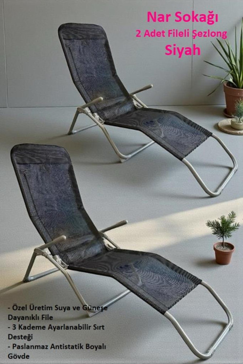 Nar Sokağı 2 Adet Katlanabilir Fileli Şezlong Plaj, Bahçe ve Balkon Sandalyesi Siyah