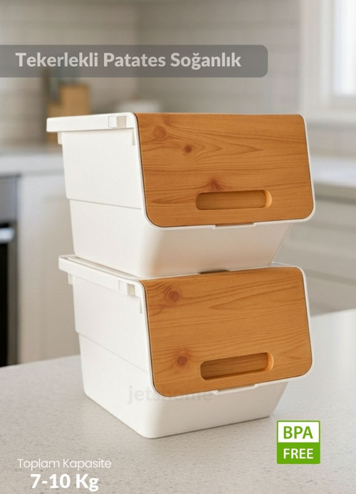 Jet' s Home 2’li Bambu-Beyaz Tekerlekli Patateslik Soğanlık Oyuncak Kutusu Patates Soğan Sepeti 24 Lt