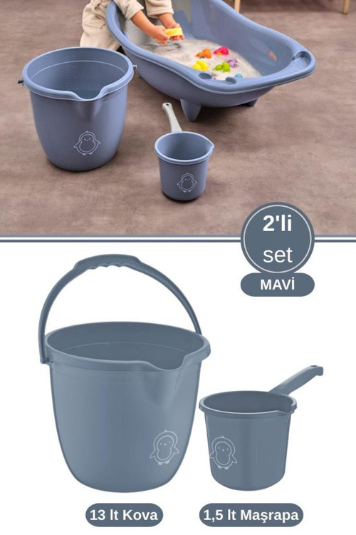 Flora 2’li Bebek Banyo Su Kovası ve Maşrapası Seti, Saplı Oluklu Kova 13lt ve Maşrapa 1,5lt Set Mavi