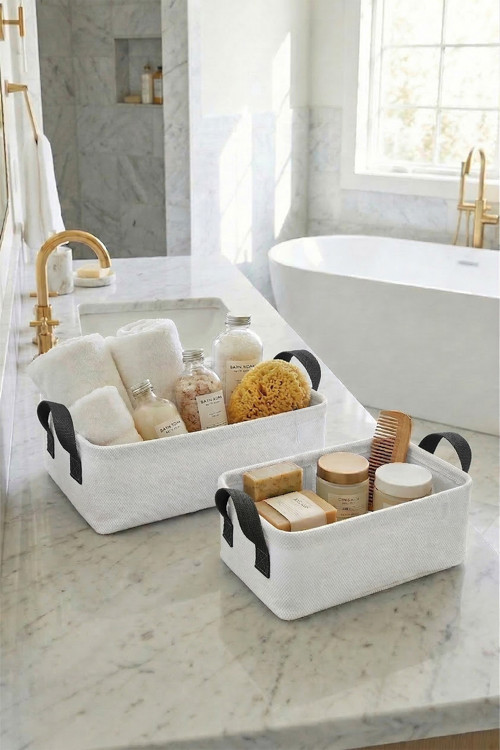 Banyonuzda dağınıklığa veda edin ve zarafete yer açın! Modern tasarımıyla dikkat çeken bu 2’li Beyaz Nonwoven Sepet Seti, hem kişisel bakım ürünlerinizi düzenler hem de mekanınıza ferah bir görünüm kazandırır.