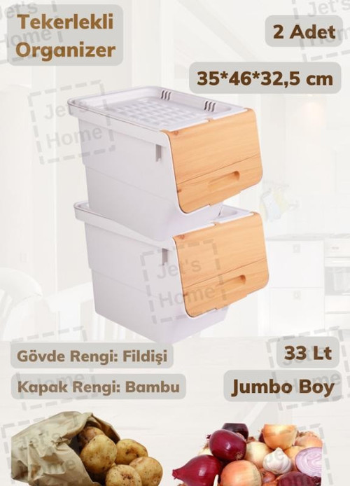 Jet' s Home 2’li Tekerlekli Patateslik Soğanlık Erzak Kutusu Oyuncaklık Sebzelik Bambu Desenli 33 Lt