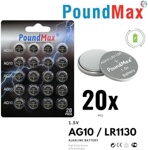 20 x PoundMax Düğme Hücresi LR1130 1,5V, Alkalin Pil Değiştirir: AG10, LR1130, G10, LR54, 189, GP89A, 389, SR1130W Yüksek kalite, yüksek veya düşük sıcaklıkta mükemmel çalışır Boyut 11,6 mm Çap x 3,1 mm Derinlik Voltajı: 1,5V