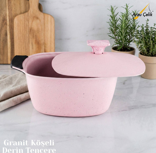 Granit Köşeli Derin Tencere (Alüminyum Kapak) - Pembe, 22x22 cm ölçüsü, 10,5 cm derinliği ve 3 L hacmi ile günlük yemekler için pratik ve ideal bir kullanım sunar. Köşeli/kare formu sayesinde tencere içindeki alanı verimli kullanır; sulu yemekler, sebze yemekleri, pilav ve fırın tariflerinde kolaylık sağlar. Granit kaplama yapısı ile yanmaz–yapışmaz yüzey sunar ve temizliği kolaylaştırır. Şık pembe rengiyle mutfağınıza modern bir dokunuş katar. Kapak kullanımını daha konforlu hale getirmek için silikon tutma aparatı ile birlikte gönderilir.