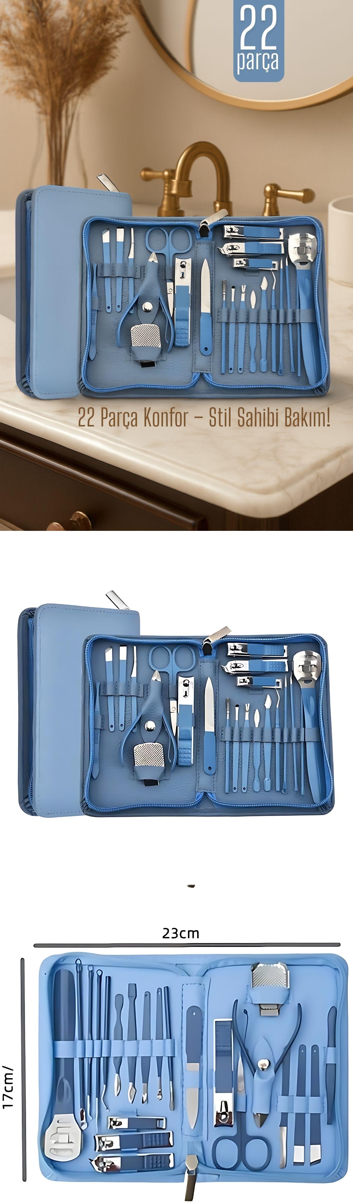 Bu 22 parçalık mavi manikür-pedikür seti, evde profesyonel bakım yapmak isteyenler için ideal. Hem tırnak hem cilt bakımı için gerekli tüm araçlar tek bir şık çantada.