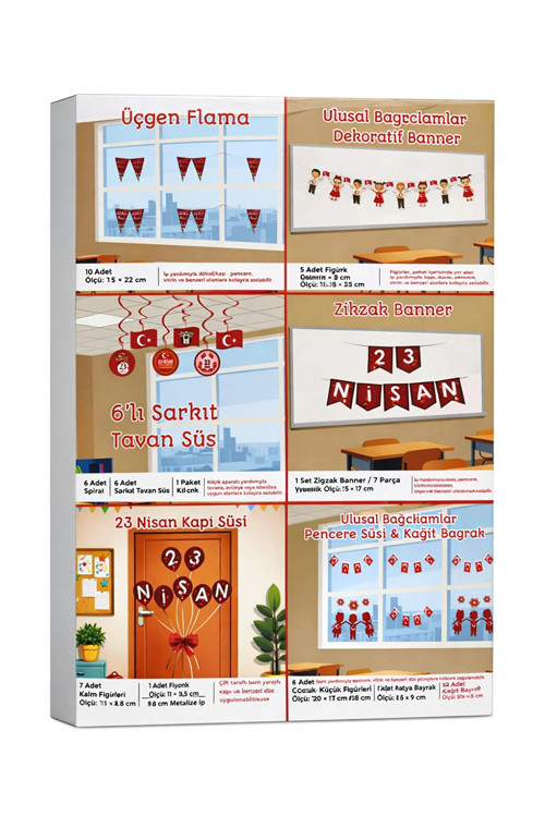 Bu set, 23 Nisan süslemelerinde en çok tercih edilen ürünleri bir araya getirerek size pratik, ekonomik ve profesyonel bir dekorasyon çözümü sunar. Özellikle öğretmenler, veliler ve organizasyon düzenleyenler için büyük kolaylık sağlar.