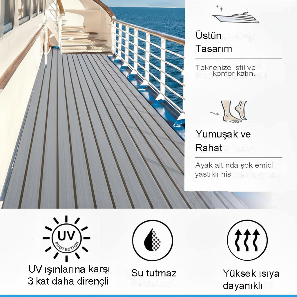 Marin Plaza güvencesiyle, 3M yapışkanlı EVA foam suni tik levhalar, teknenizde hem lüks bir görünüm hem de eşsiz bir konfor yaratır. Estetik ve güvenliği bir araya getiren bu kaymaz zemin kaplamaları, tik desenli yüzeyiyle göz alıcı bir şıklık sunar. Üstelik montajı o kadar basittir ki, "soy ve yapıştır" teknolojisi sayesinde dakikalar içinde uygulayabilirsiniz.