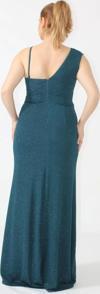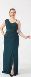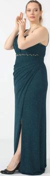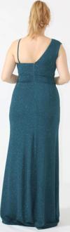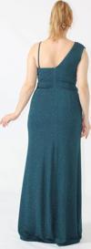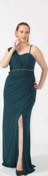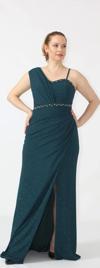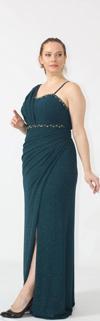 2402 Tek Omuzu Kalın Simli Kumaş Beli İşlemeli Yırtmaçlı Abiye.
