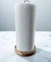 Ahşap stand, doğal bir güzellik ve sıcaklık sağlarken, metal teller kağıt havlularınızı düzgün bir şekilde tutar ve dağılmalarını önler.