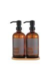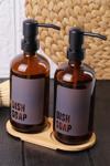 2’li Amber Cam Sıvı Sabunluk Seti – Gri Etiketli & Standlı | Şık ve Fonksiyonel Tasarım