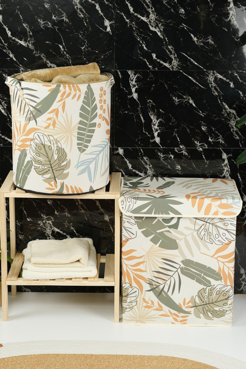 PH Prendi Home 2'li Yaprak Desenli Silindir Ve Dikdörtgen Büyük Boy Kapaklı Saklama Kutusu 40x50x30cm Sepet 37x40cm