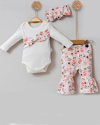 3-6-9-12 Ay Kız Bebek Takım Çiçek Desenli Fiyonklu 3'lü Krem
