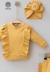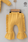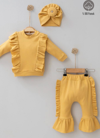 3-6-9-12 Ay Kız Bebek Takımı Omuzdan Fırfır Detaylı Boneli 3'lü %100 Pamuklu Hardal