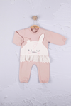 3-6-9-12 Ay Kız Bebek Tulum Tavşan Nakışlı Güpürlü %100 Pamuk Gül Kurusu