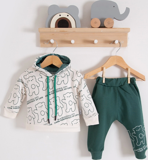 3-6-9-12-18 Ay Erkek Bebek Takımı Çapraz Bears Kapüşonlu %100 Pamuk Yeşil