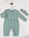 3-6-9-12-18 Ay Kız Bebek Tulumu Düğme Detaylı Bandanalı %100 Pamuk Yeşil