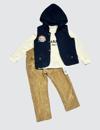 Takım, fitilli kadife pantolon, kapitone kapşonlu yelek ve uzun kollu sweat'ten oluşur.