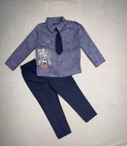 Ftt 3-4-5 Yaş Kravatlı Keten Gömlek Gabardin Pantolon Uzun Kollu 3lü Erkek Çocuk Takımı Lacivert