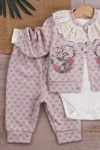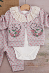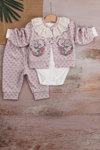 3-6-9 Ay Kız Bebek Takım Brode İşlemeli Kalp Desenli 3'lü Hırkalı Lila