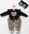3-6-9 Ay Kız Bebek Tulum Leopar Desenli Fiyonklu %100 Pamuk Siyah