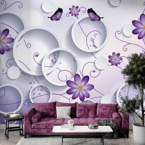 Duvar Kağıdı Baskı 3 Boyutlu Daire, Mor Çiçek ve Kelebek Desenli Duvar Kağıdı Baskı