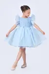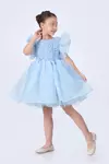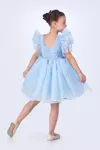 Kız Çocuk Omuzları ve Beli Fırfırlı Puantiye Detaylı Şeffaf Tül Çiçek Desenli Kabarık Mavi Elbise - Image 1