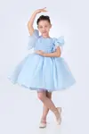 Riccotarz Kız Çocuk Omuzları ve Beli Fırfırlı Puantiye Detaylı Şeffaf Tül Çiçek Desenli Kabarık Mavi Elbise