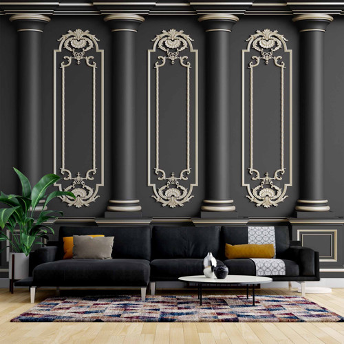 3 Boyutlu Siyah Panel Altın Sütun ve Motif Duvar Kağıdı Baskı