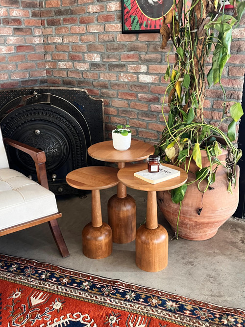 Tamamı masif ahşaptan üretilen sehpa takımı, sağlam gövdesi ve dengeli tabanı sayesinde güvenli ve uzun ömürlü bir kullanım sunar. Üst yüzeyler; dekoratif objeler, mumlar, kitaplar veya günlük kullanım eşyaları için uygundur.