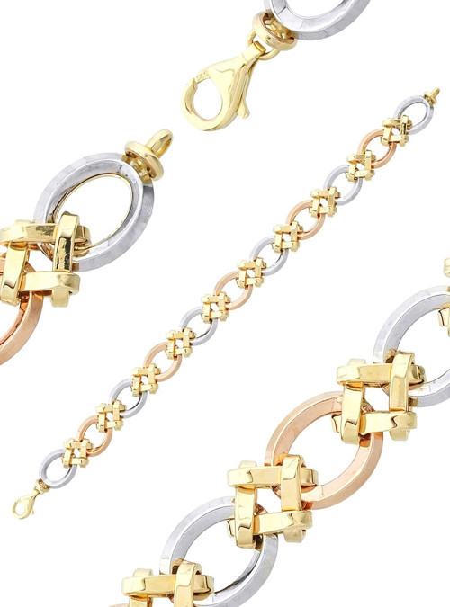 14 ayar sarı, beyaz ve pembe altın (rose gold) ile ürettiğimiz; 3 Renk Altın Hallow Bileklik 'imiz ipeksi parlak ve tamamen parlak bölümlerden oluşan bir Altın Bileklik 'tir. Farklı renklerdeki altın halkalar ile sportif bir görüntü de sunan altın bileklik gün içinde veya çalışırken kıyafetlerinizle kombinleyebileceğiniz bir Modern Bileklik 'tir.
